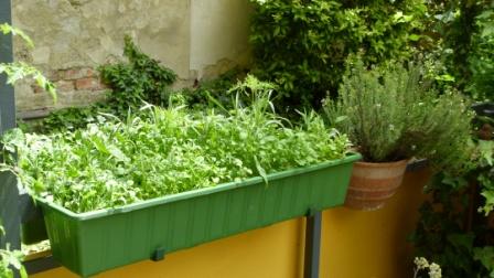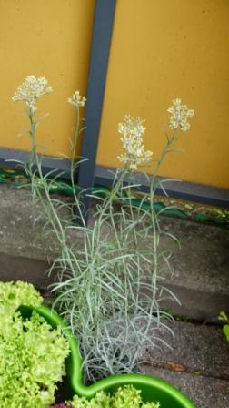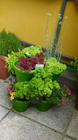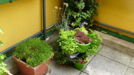 Mein "Hochbeet" mit Pflücksalat und Currykraut.